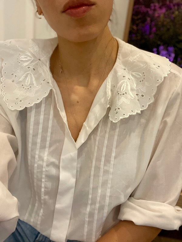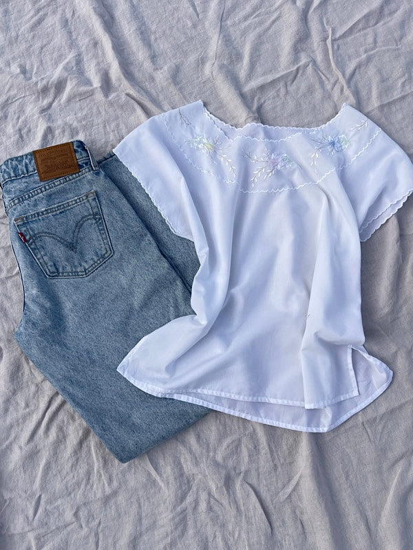 Vintage White Embroidered Cotton Short-Sleeved Blouse