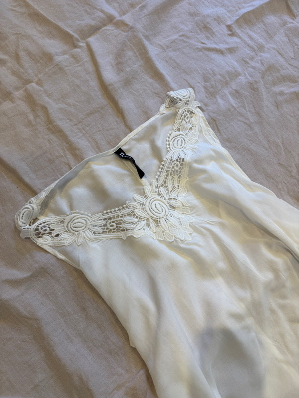 One-Of-A-Kind//Vintage White Sleeveless, restored & in perfect condition.  The sleeveless has cotton crochet detail and A-line cut in soft flowing fabric.  Please note our vintage clothing is final sale due to the delicate nature of the garments and one-off nature.  Care Instructions: Hand wash with a mild detergent, dry flat in the shade, no tumble dry.