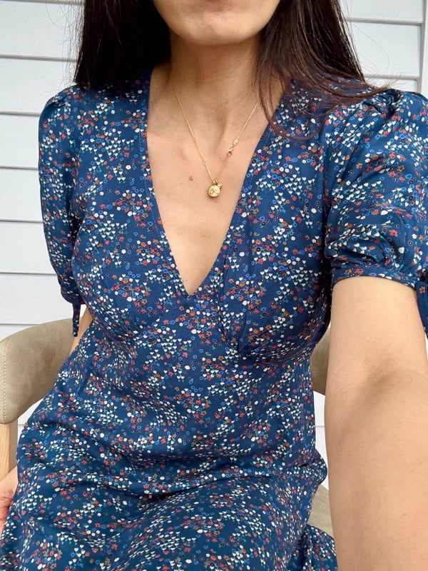 Our Dylan Blue Vintage Floral Midi Dress is a remake of an effortless vintage dress, in vintage blue floral print, sustainably made from upcycled/surplus rayon fabric. The dress features (see swatch for close-up of print available):